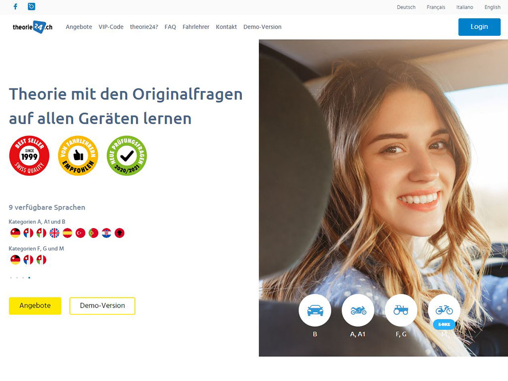 HINWEIS:Seit Januar 2008 kann die Theorieprüfung beim Strassenverkehrsamt nur noch in den Sprachen Deutsch, Französisch, Italienisch (teilweise Englisch) abgelegt werden! Als Lernunterstützung sind die Theoriefragen der Kategorien B, A, A1 weiterhin in 9 Sprachen verfügbar: