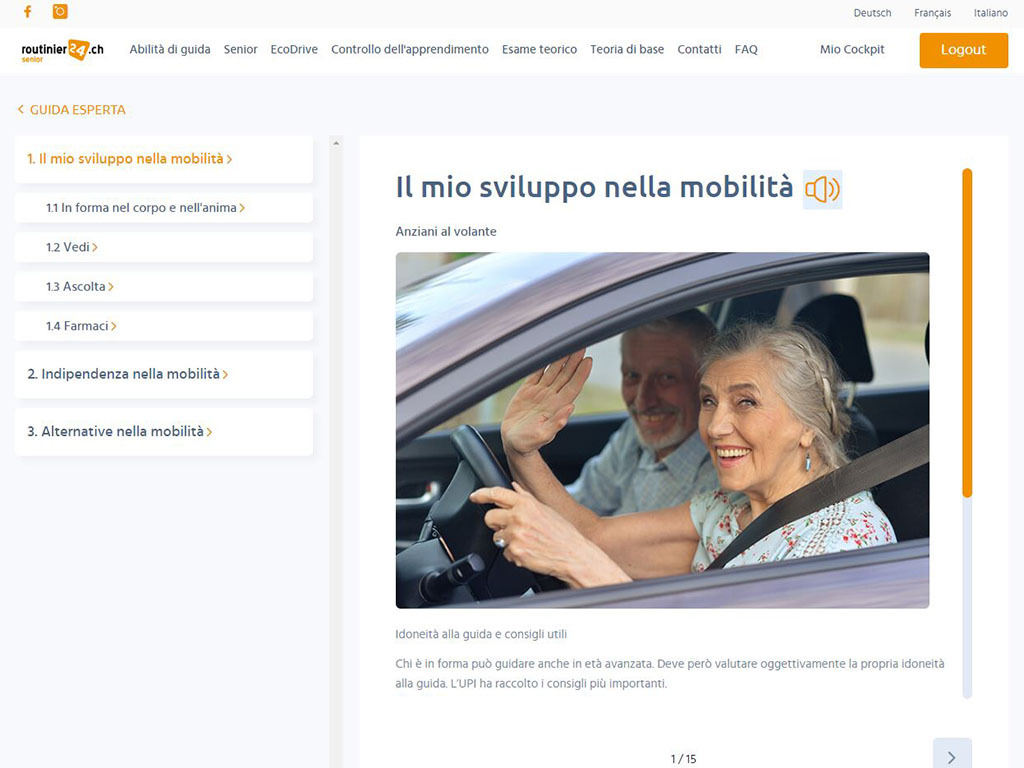 Una raccolta di argomenti e contenuti per aiutarvi a rimanere in strada in sicurezza anche invecchiando: non sopravvalutate la vostra vista, non sottovalutate l'influenza dei farmaci, non sottovalutate l'influenza dei farmaci, trovate l'auto giusta o informazioni utili sull'indipendenza mobile.